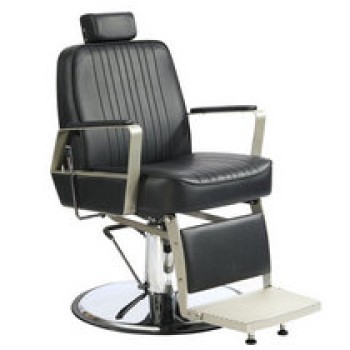 5 . This reclining barber chair features sturdy construction, a round chrome base, heavy duty round hyd-raulic pump and base and an adjustable/removable headrest.