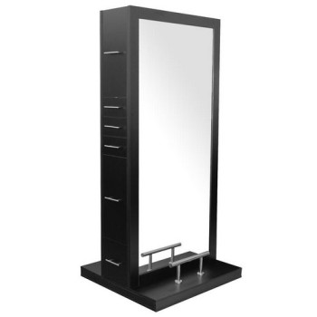 The Odyssey double sided styling station is an ultra modern styling station with sleek lines. Featuring full length mirror, tons of storage, and chrome footrest