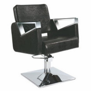 All new modern salon chair hairdressing equipment design with clean lines and squared arms. Chrome base and European style T-shaped footrest for maximum support. Durable hydraulic matching chrome base with angled design. Supports up to 325 lbs. with adjustable height.